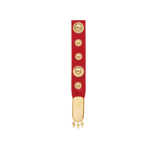 Fangbelte har lange tradisjonar i Hardanger og er ein viktig del av den tradisjonelle draktskikken. Mange opplever at bunaden blir meir komplett når det er med. Dette fangbeltet i rødt skinn er utsmykka med 12 borer og eit endestykke med graverte detaljar.